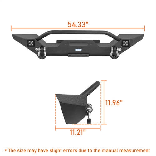 Heavy Duty Construction. Built with heavy-duty steel construction, using 11-gauge (1/8 inch) steel for this front bumper main body and a robust 1.50" x 0.06" steel tube construction. This ensures exceptional durability and strength. The bumper also features a textured black powder coat finish and a premium E-coating process inside, providing excellent resistance against corrosion and environmental elements, ensuring long-lasting performance and a rugged appearance.