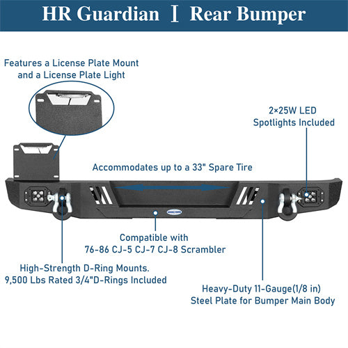 Basic and Functional. The Guardian Ⅰ Rear Bumper is a one-piece structure that blends rugged off-road styling with practical functionality. Designed to provide reliable rear-end protection for your vehicle, it features 2×25W LED spotlights and a dedicated license plate light for improved visibility. High-strength D-ring mounts, paired with 9,500 lbs rated 3/4" D-rings, enhance towing capabilities. Additionally, the bumper includes a convenient license plate mount, making it stylish and functional for off-road adventures.