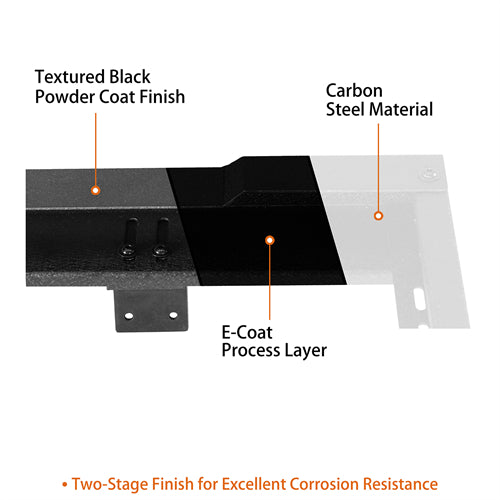 - The side panels, front and rear panels are made from high tensile 13-gauge(3/32 Inch) steel construction. They are also treated with both a textured black powder coat finish and a premium E-coating process