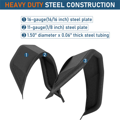 Heavy-Duty Construction. The Flux Tube Fender Flares are constructed from robust materials for enhanced durability. They are made from 1.5" diameter × 0.06" thick steel tubes, combined with 16-gauge and 11-gauge steel. This construction ensures exceptional strength and resilience. The fender flares feature a textured black powder coat finish on the exterior, providing a rugged and stylish look. The premium E-coating process on the inside offers superior corrosion resistance, ensuring long-lasting protection and performance.
