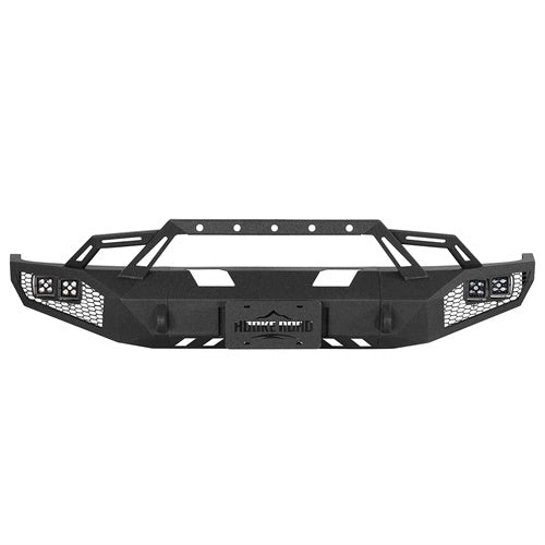 Aggressive Off-Road Styling. The Earthshaker Series Front Bumper is a rugged and stylish upgrade for off-road enthusiasts. It features four powerful 25W LED spotlights for enhanced visibility, along with a honeycomb steel plate design for added durability. The bumper includes high-strength D-ring mounts (D-rings sold separately) and a built-in winch plate capable of handling up to 12,000 lbs. A flip-up license plate mount ensures compliance with regulations while maintaining a sleek look.