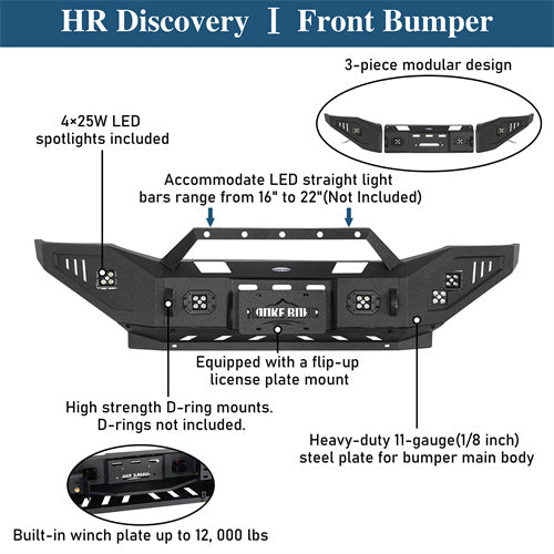 Bold Off-Road Aesthetics. The Discovery I Front Bumper is a rugged and versatile upgrade designed for off-road performance and utility. It features four 25W LED spotlights, ensuring visibility in low-light conditions. Built with high-strength D-ring mounts for secure towing, it also includes a license plate mount. A solid skid plate provides essential undercarriage protection, while the integrated winch plate supports up to 12,000 lbs, making it ready for serious recovery situations.
