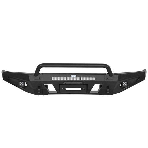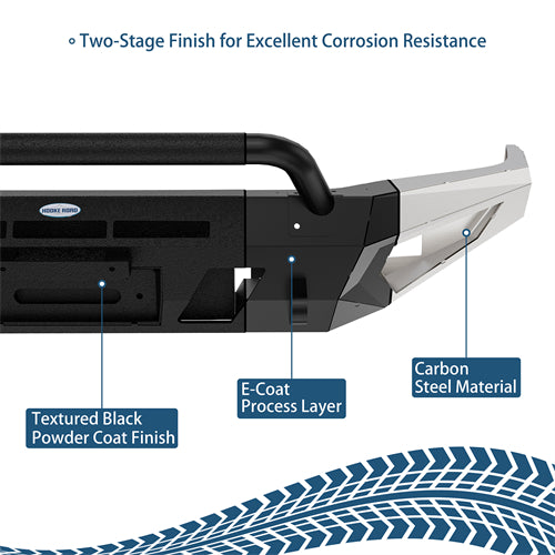 Tough Build Quality. Constructed for exceptional durability, the bumper’s main body is made from heavy-duty 11-gauge (1/8 inch) steel plate, paired with a robust 1.89" × 0.06" steel tube for the tube structure. The winch plate and mounting structure utilize a thicker 9-gauge (5/32 inch) steel plate, ensuring superior strength and stability. It features a textured black powder coat finish combined with a premium E-coating process on the inside, offering outstanding corrosion resistance and a long-lasting, rugged appearance.