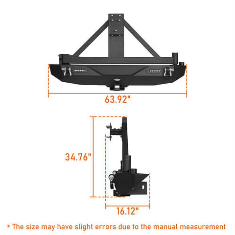 DIFFERENT TRAIL REAR BUMPER - Heavy-duty steel construction: 11-gauge(1/8 inch) plate for the bumper main body; 2" Standard Hitch Receiver; Can Accommodate Up to a 37" Tire; High Strength D-Ring Mounts w/ D-Rings Included; Two Stage Textured Black Powder Coat Finish; Rock Crawler Rear Bumper with Tire Carrier, don't open with the door