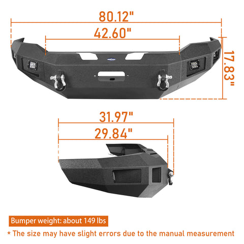 - Heavy-duty steel construction: 11-gauge(1/8 inch) for the bumper body, 8-gauge(11/64 inch) steel for the winch plate and mounting parts