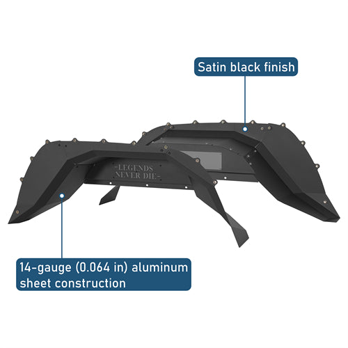 Heavy Duty Aluminum. Crafted from durable 14-gauge (0.064 in) aluminum sheet, these rear fender liners offer superior strength while remaining lightweight. The satin black finish not only enhances aesthetics but also provides additional corrosion resistance for long-lasting durability, whether facing rock impacts or muddy trails, etc. They maintain protection without adding unnecessary weight to your vehicle.