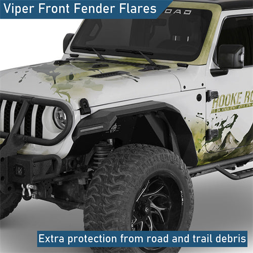 Style and Protection. With aggressive, angular contours, the Viper Flat Style Front Fender Flares are a bold upgrade for off-road enthusiasts seeking style and functionality. Designed to provide enhanced tire coverage and shield your vehicle from road and trail debris, they also include two LED lights that function as both daytime running lights and turn signals. These LEDs offer a sleek, professional-grade design that enhances visibility and adds a modern, eye-catching flair to your ride.