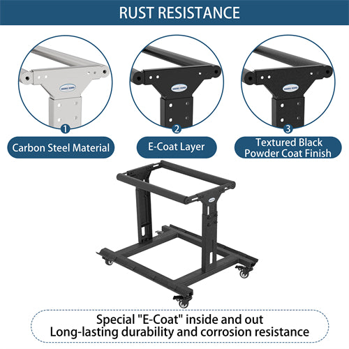 Stable and Lightweight Structure. Crafted with durability in mind, the storage cart features heavy-duty construction using 11-gauge (1/8 inch) and 16-gauge (1/16 inch) steel plates. The textured black powder coat finish not only adds a sleek look but also enhances resistance to corrosion and wear. Additionally, the interior is treated with a premium E-coating process, further enhancing its longevity. The steel material ensures robustness, allowing the cart to support the weight of the doors effectively.