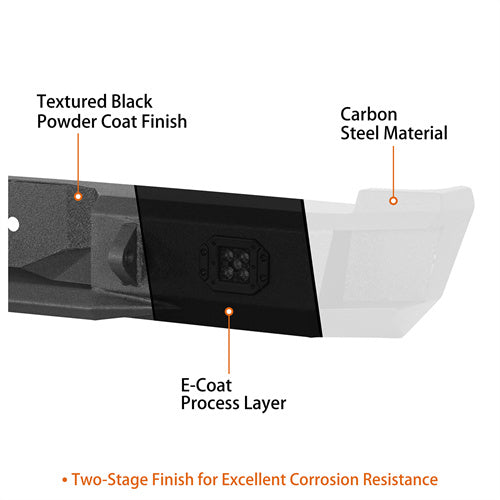High-Strength Construction. The Guardian Ⅱ Rear Bumper main body is made from 11-gauge (1/8 in) steel, providing solid rear-end protection, while the mounting structure uses even thicker 8-gauge (11/64 in) steel to ensure a secure installation. The bumper is finished with a textured black powder coat and a premium E-coating process on the inside. It offers long-lasting protection against rust and the elements, making it ideal for tough outdoor conditions.