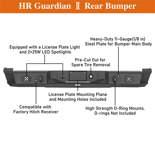 Enhances Protection. The Guardian Ⅱ Rear Bumper is a robust, one-piece structure that provides rear-end protection. It includes a built-in license plate light and two 25W LED spotlights, ensuring enhanced visibility. The bumper also features a designated plane, pre-drilled mounting holes for a license plate, and a pre-cut opening for easy spare tire removal. Additionally, it includes high-strength D-ring mounts and built-in side steps for quick access to the truck bed. The bumper is compatible with a factory hitch receiver, making it highly functional and durable.