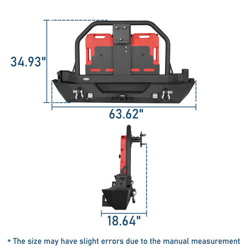 This Rear Bumper with Tire Carrier is specifically designed for use on 2007-2018 Jeep Wrangler JK models, including 2 and 4 door models.