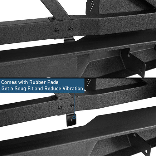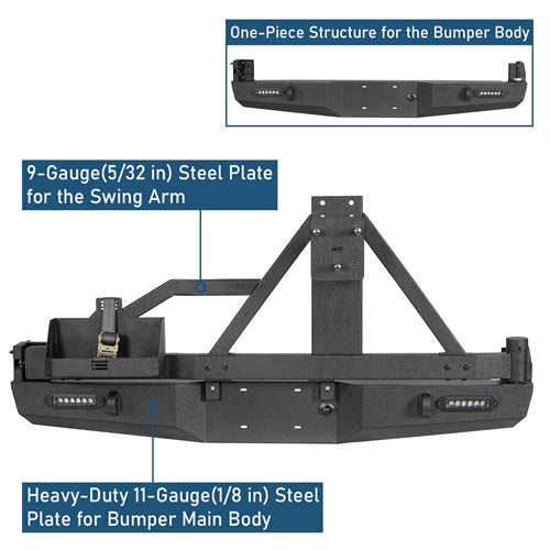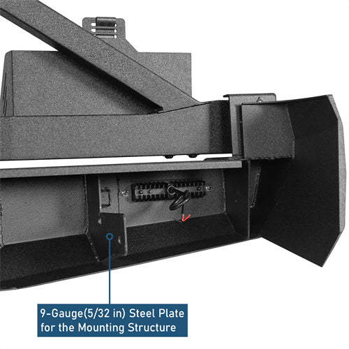 Heavy Duty Construction. Constructed from heavy-duty, high-tensile 11-gauge (8/11 in) steel for the Explorer Rear Bumper main body, 9-gauge (5/32 in) steel for the mounting structure, and 9-gauge (5/32 in) steel for the swing arm. This robust construction ensures durability and strength, providing excellent off-road protection. The textured black powder coat finish, along with the premium E-coating process inside, adds both style and corrosion resistance to the bumper, making it suitable for challenging off-road environments.
