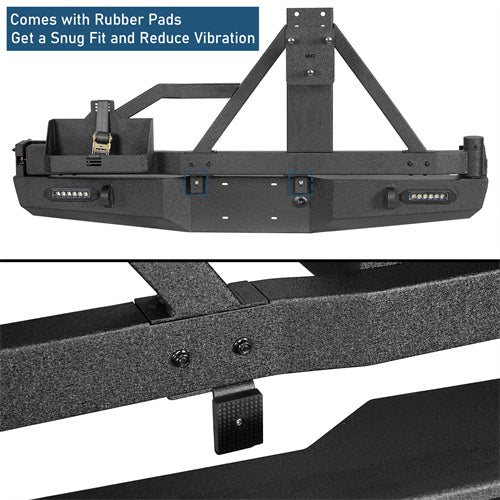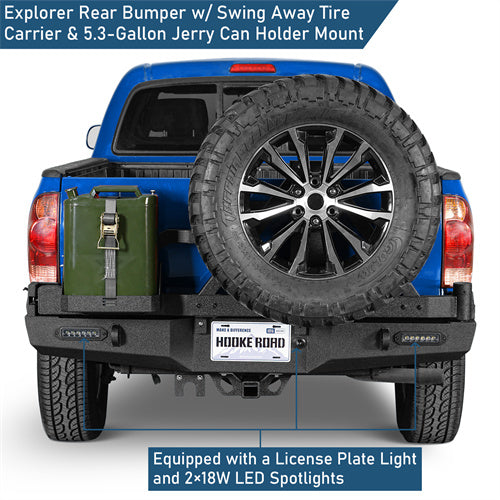 Durable and Robust. The Explorer Rear Bumper with Swing Away Tire Carrier and 5.3-gallon Jerry Can Holder Mount is designed with durability and robustness for excellent off-road protection. It comes equipped with a license plate light and two 18W LED spotlights. The bumper features high-strength D-ring mounts (D-rings not included) for recovery purposes. Additionally, it includes a license plate mounting plane and mounting holes for added convenience. The swing-away tire carrier and jerry can holder enhance the functionality of the bumper, providing storage solutions for essential off-road gear.