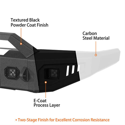 Heavy Duty Construction. The Discovery I Front Bumper is crafted from heavy-duty, high-tensile 11-gauge (1/8 in) steel for the main body, ensuring durability and strength for off-road use. The mounting structure and winch plate are made from even thicker 9-gauge (5/32 in) steel for enhanced support. It features a textured black powder coat finish that provides a rugged, corrosion-resistant surface. The inside is treated with a premium E-coating process, offering long-lasting protection against rust and wear, making this bumper both tough and dependable for off-road adventures.