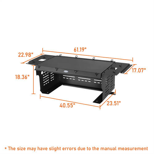 Solid Construction. Crafted for durability and strength, this Security Deck Enclosure boasts a durable powder coat finish that not only enhances its aesthetics but also provides exceptional resistance to corrosion and wear. The main structure is constructed from heavy-duty 14-gauge (5/64 inch) welded steel, ensuring robustness and longevity. The enclosure also features 16-gauge (1/16 inch) steel components, adding to its structural integrity. This combination of high-quality steel materials and a powder coat finish ensures that the enclosure can withstand the demands of off-road adventures and maintain its sleek appearance.