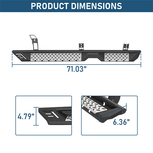 Easier Vehicle Access. The Nerf Side Step Bars enhance accessibility and protection for your vehicle. Equipped with durable, non-slip step pads featuring diamond-shaped particle surfaces, they provide secure footing in various conditions. Stylish stainless steel plates add a refined appearance while boosting durability. These side step bars create a stable step for easier entry and exit, while their rugged construction offers dependable side and undercarriage protection against rocks, debris, and trail hazards during off-road use.
