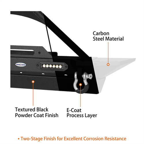 High-Quality Construction. Crafted from heavy-duty steel, this front bumper is built to last. The bumper main body is constructed with 11-gauge(1/8 inch) plate steel, while the stinger bar uses 1.50" × 0.06" tube steel. The textured black powder coat finish and premium E-coating process inside provide added strength and durability, protecting the bumper from rust and corrosion. At about 61 lbs, this bumper is solid and reliable, offering the strength and durability you need on the toughest trails.