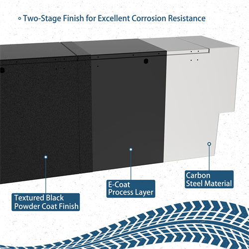 Solid Steel Construction. Crafted from durable 18-gauge (0.048-inch) steel plate, the storage boxes offer solid structural integrity for off-road and worksite use. The textured black powder coat finish adds a sleek, aggressive appearance while delivering scratch and corrosion resistance. An inner premium E-coating process further protects the steel from rust and extends the product's overall life.