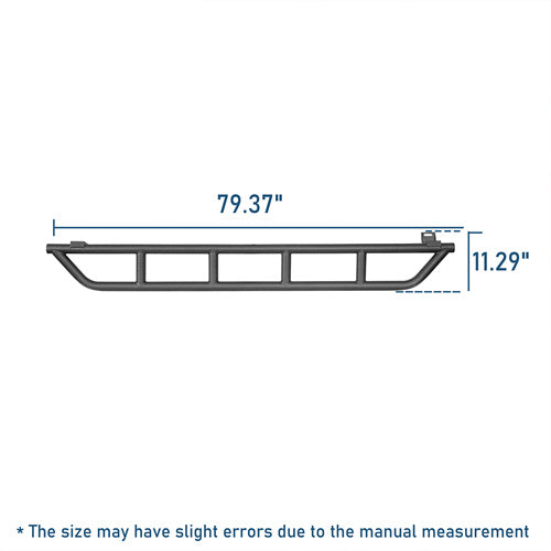 Heavy Duty Construction. Fabricated from robust 1.9"" diameter x 0.06"" thick steel tubing, these Tube Slider Rocker Guards boast exceptional strength. The textured black powder coat finish not only enhances their rugged appearance but also provides effective corrosion resistance. Employing a premium E-coating process on the interior ensures long-lasting durability against various elements. This combination of thick steel tubing and advanced coatings not only fortifies your Tacoma against off-road challenges but also adds a sleek, textured finish.