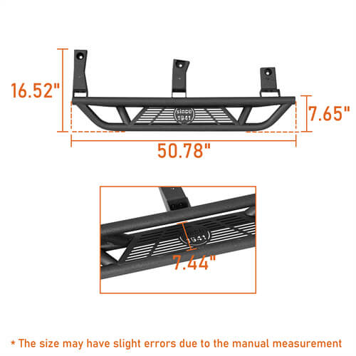 Heavy Duty Construction. Crafted from durable 1.9" diameter x 0.06" thick steel tubing and featuring a 14-gauge (5/64 inch) steel plate construction, these Tubular Side Step Bars are built to withstand the rigors of the road. The textured black powder coat finish not only adds a rugged aesthetic but also provides resistance against corrosion, while the premium E-coating inside ensures long-lasting durability.